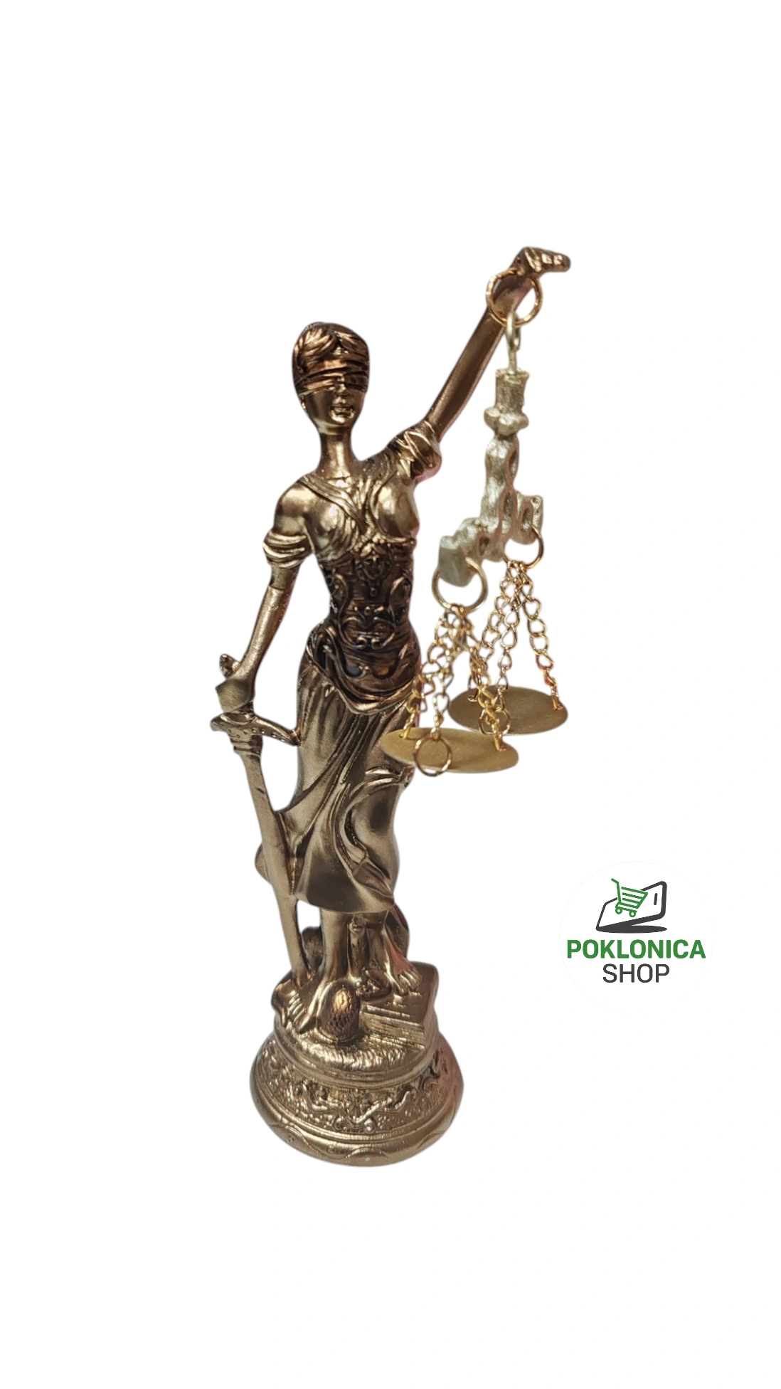 Boginje pravde (Justicije) je dekorativna statua izrađena u zlatnoj boji. Statua prikazuje Boginju sa povezom preko očiju, držeći u jednoj ruci mač, a u drugoj vagu, što simbolizuje pravdu, nepristrasnost i pravednost. Ovaj detalj može biti odličan izbor za kancelarije, sudske prostorije ili kao elegantan ukras u vašem domu.