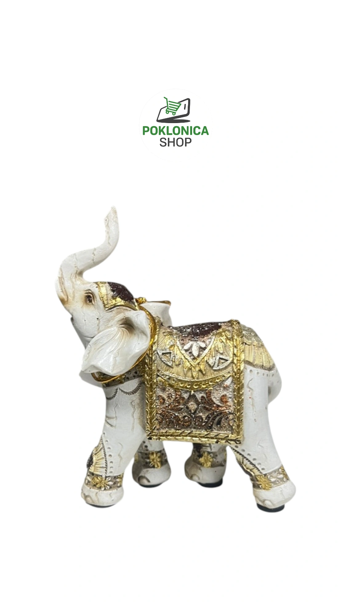 Opis: Elegantna figura slona s belom osnovom i zlatnim ornamentima; reflektuje svetlost diskretno dajući blagi sjaj zlatnih detalja. Namenjena za dekoraciju enterijera, police, stočiće i kao poklon.