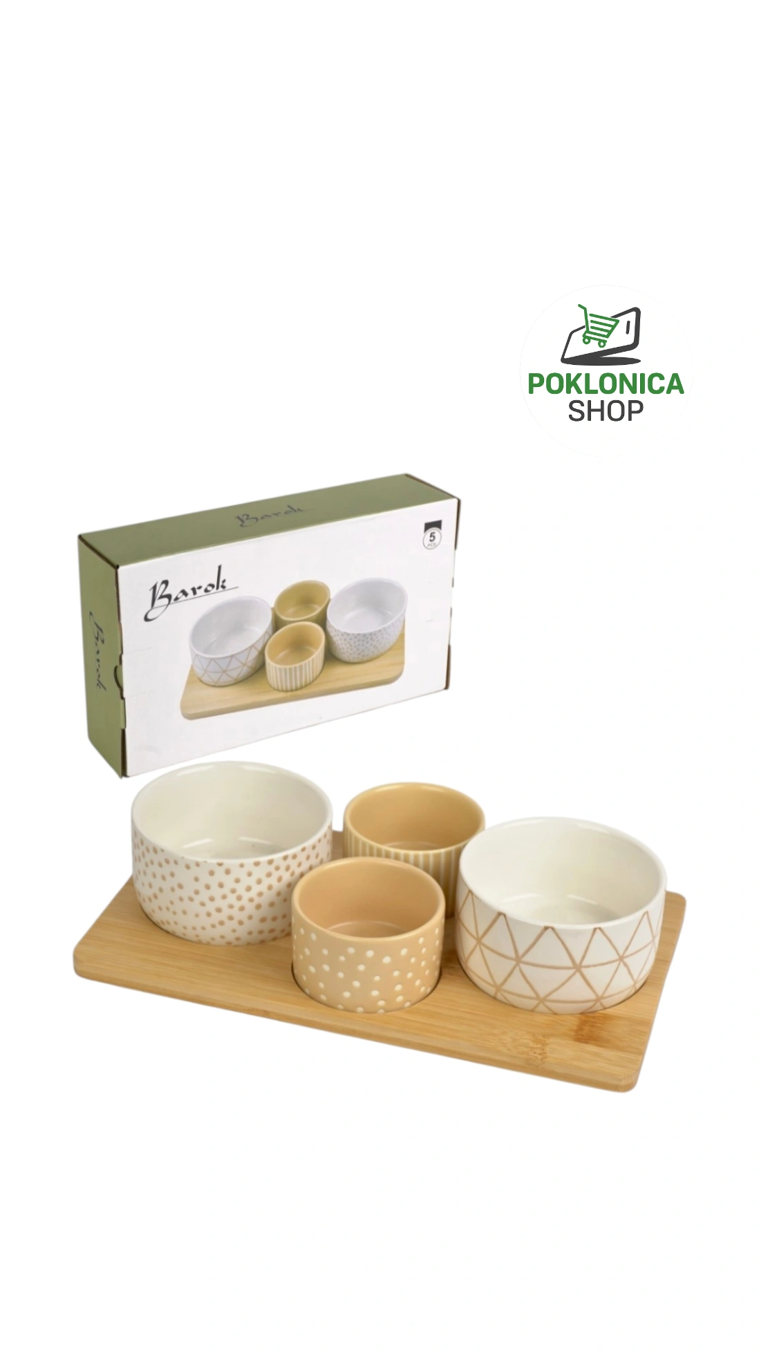 Keramičke činije sivo bele je elegantan set keramičkih posudica na bambus poslužavniku — savršen za posluživanje sosova, začina, grickalica i meza. Keramičke posudice su izrađene od kvalitetne keramike u nežnim bojama i različitim oblicima, a bambus poslužavnik daje prirodan i dekorativan izgled trpezi. Idealno za svakodnevnu upotrebu i kao poklon za domaćinstvo ili prijeme.