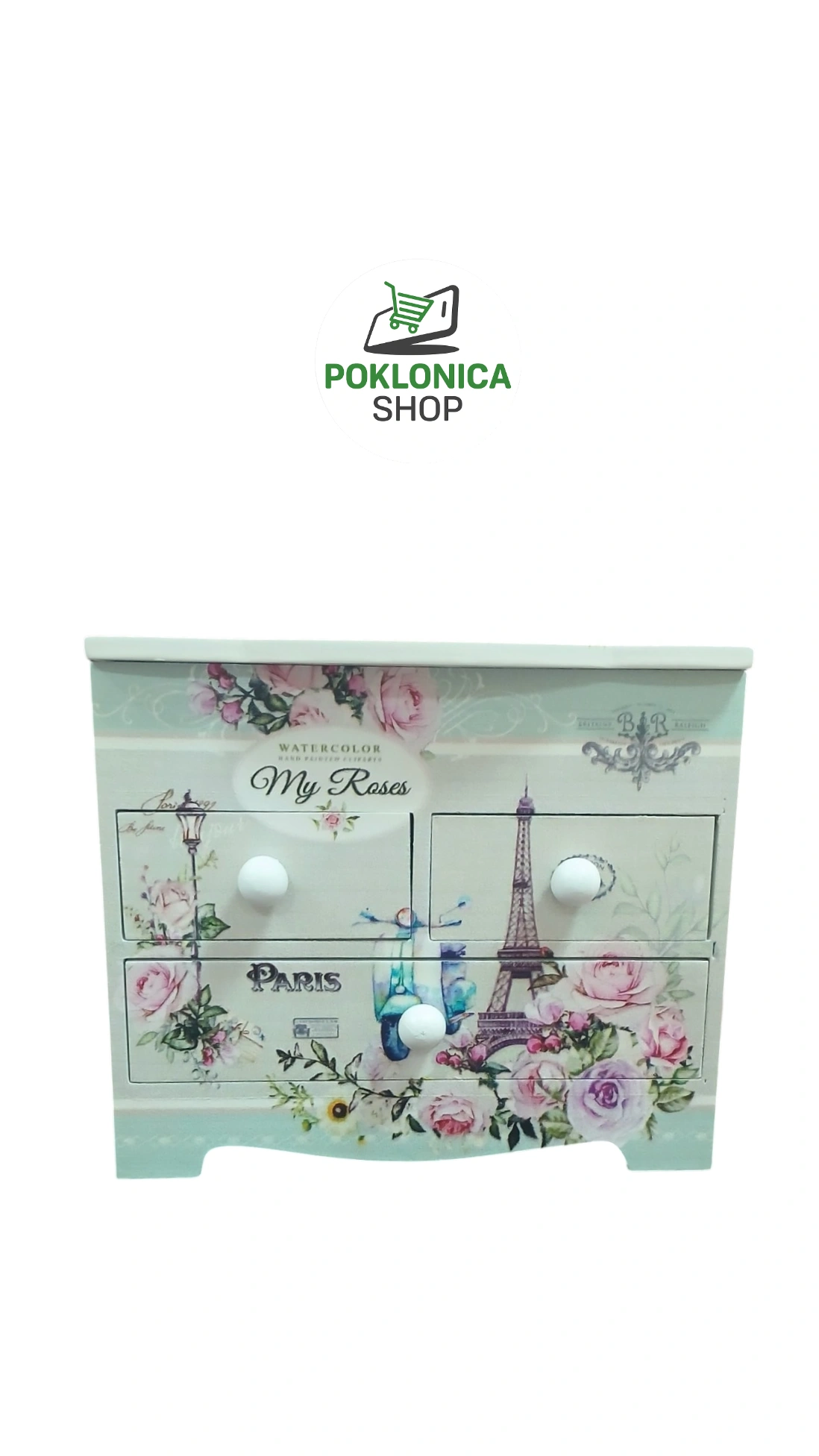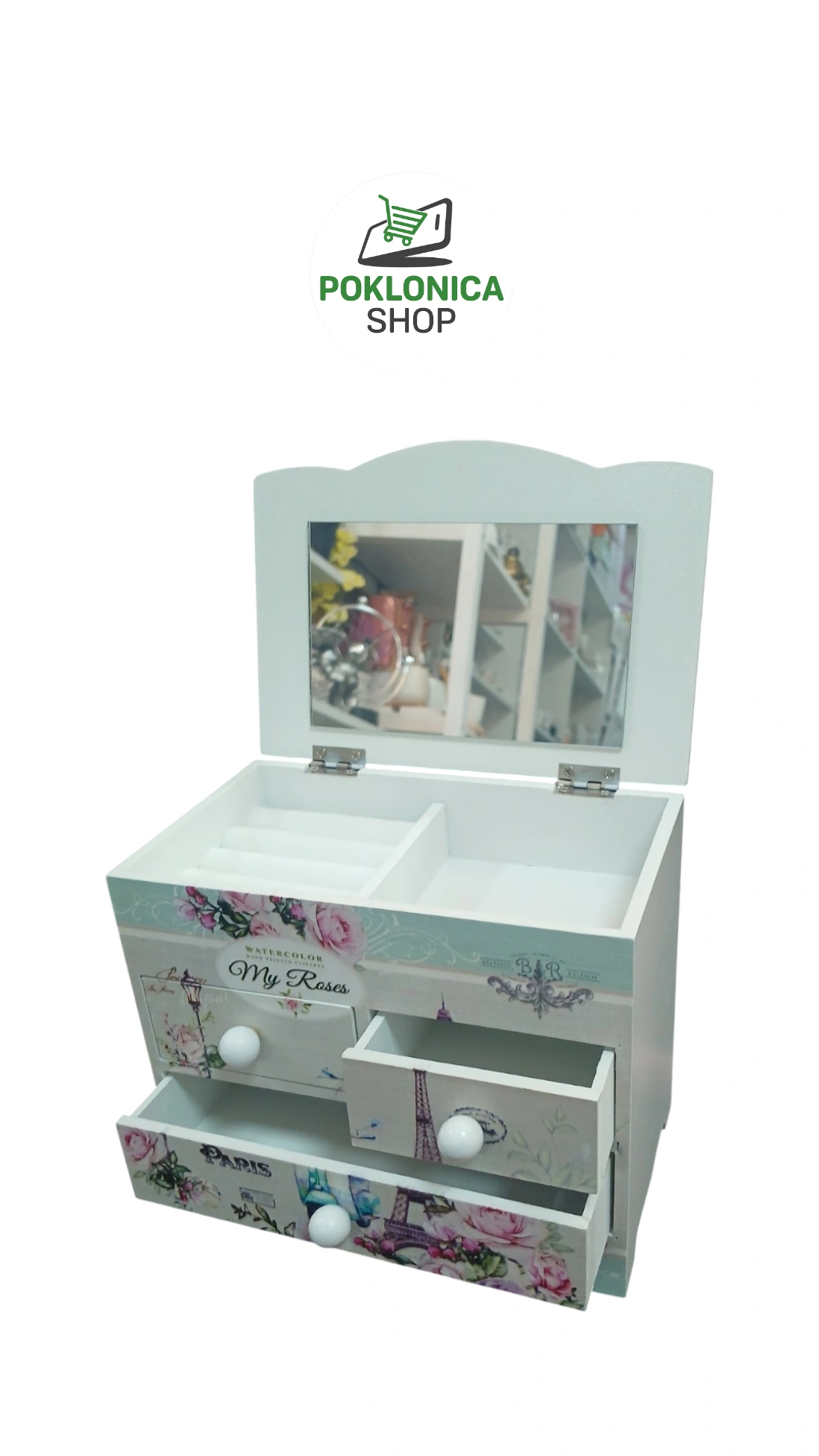 Kutija za nakit pariz je relepa drvena kutija za nakit sa ogledalom i tri fioke, ukrašena romantičnim decoupage motivima u pastelnoj paleti. Gornji deo se podiže i otkriva ogledalo i prostore za prstenje, minđuše i ogrlice, dok donje dve fioke pružaju dodatni prostor za veće komade i sitnice. Izrađena od čvrstog drveta, sa diskretnim keramičkim dugmićima i pažljivo obrađenim detaljima, ova kutija kombinuje funkcionalnost i estetski šarm. Idealna za organizaciju nakita na toaletnom stočiću, kao dekorativni element u spavaćoj sobi ili kao pažljiv poklon za rođendane i posebne prilike. Lako se uklapa u shabby chic, vintage i ženstvene enterijere.